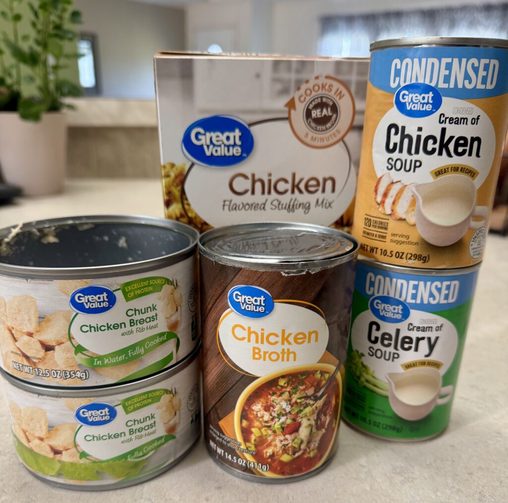 Off brand chicken stuffing $0.97, off brand chicken $1.24 x 2, off brand cream of chicken $0.70, off brand cream of celery $0.70, 1 cup chicken broth $0.41.